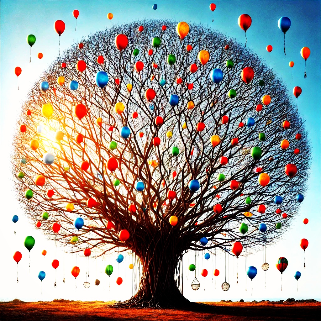 Imagine a vast, leafless tree standing tall beneath a bright, open sky. Beneath its roots lies the soil that nurtured it; above its branches float hundreds of colorful balloons—some drifting freely toward the heavens, some caught among the branches, and others bursting before they could soar.